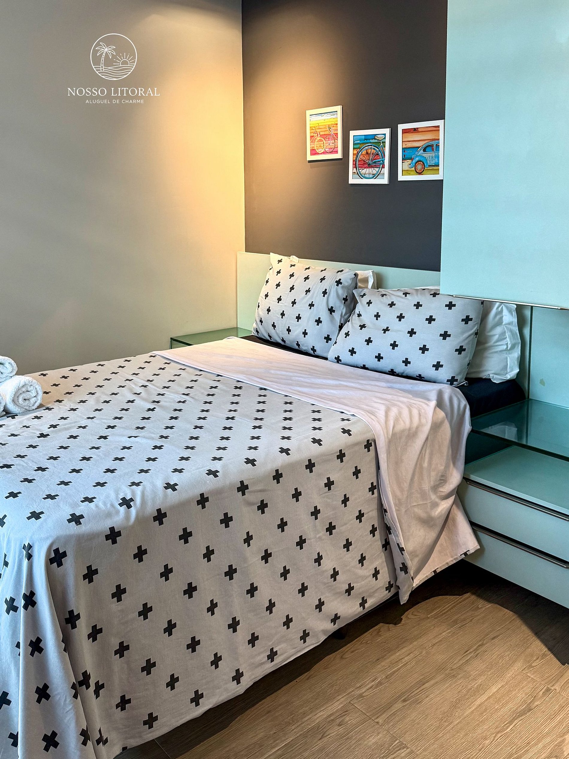 Suíte Relaxante: Quarto climatizado com cama de casal confortável e armário planejado. Oferecemos enxoval completo (cama e banho) de qualidade hoteleira, higienizado e pronto para uso;