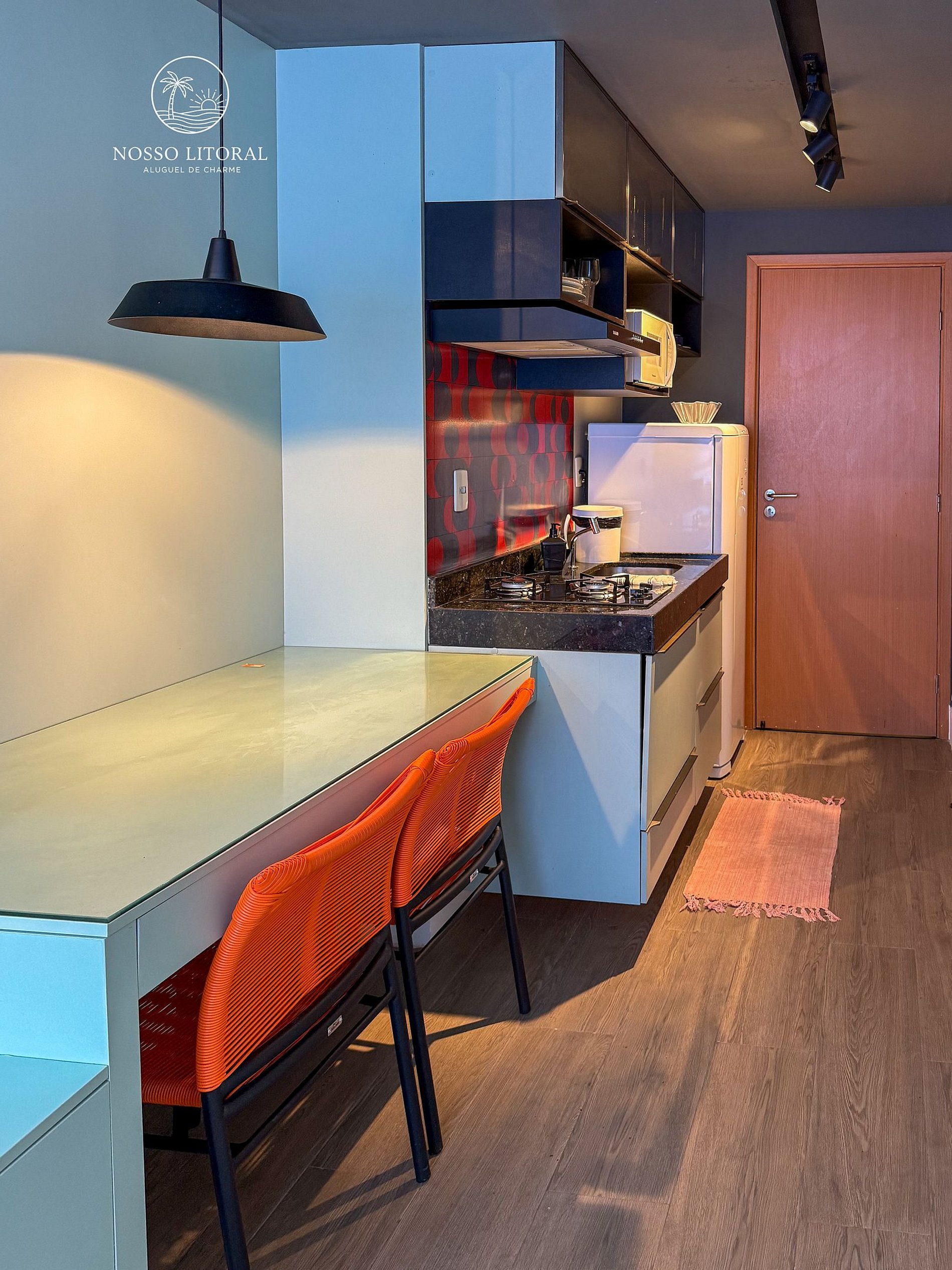 Cozinha Gourmet Compacta: Totalmente equipada com cooktop, micro-ondas, geladeira, sanduicheira e utensílios. Liberdade total para preparar seus petiscos à beira da sua piscina.